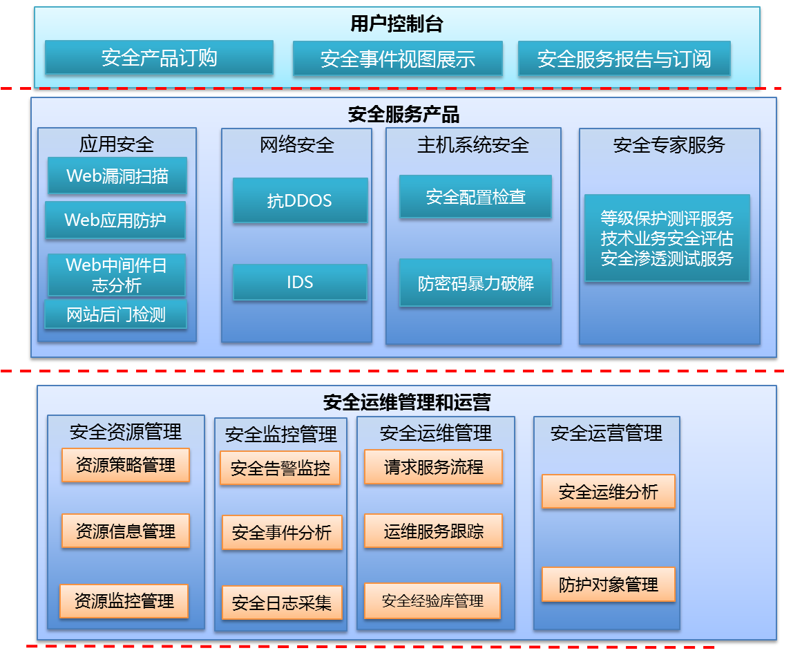 平台提供安全服务产品的订购和开通使用,用户防护资产,各安全产品的安全事件报告,安全事件监控,运维管理,运营分析等