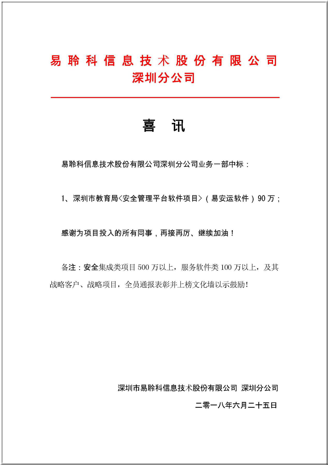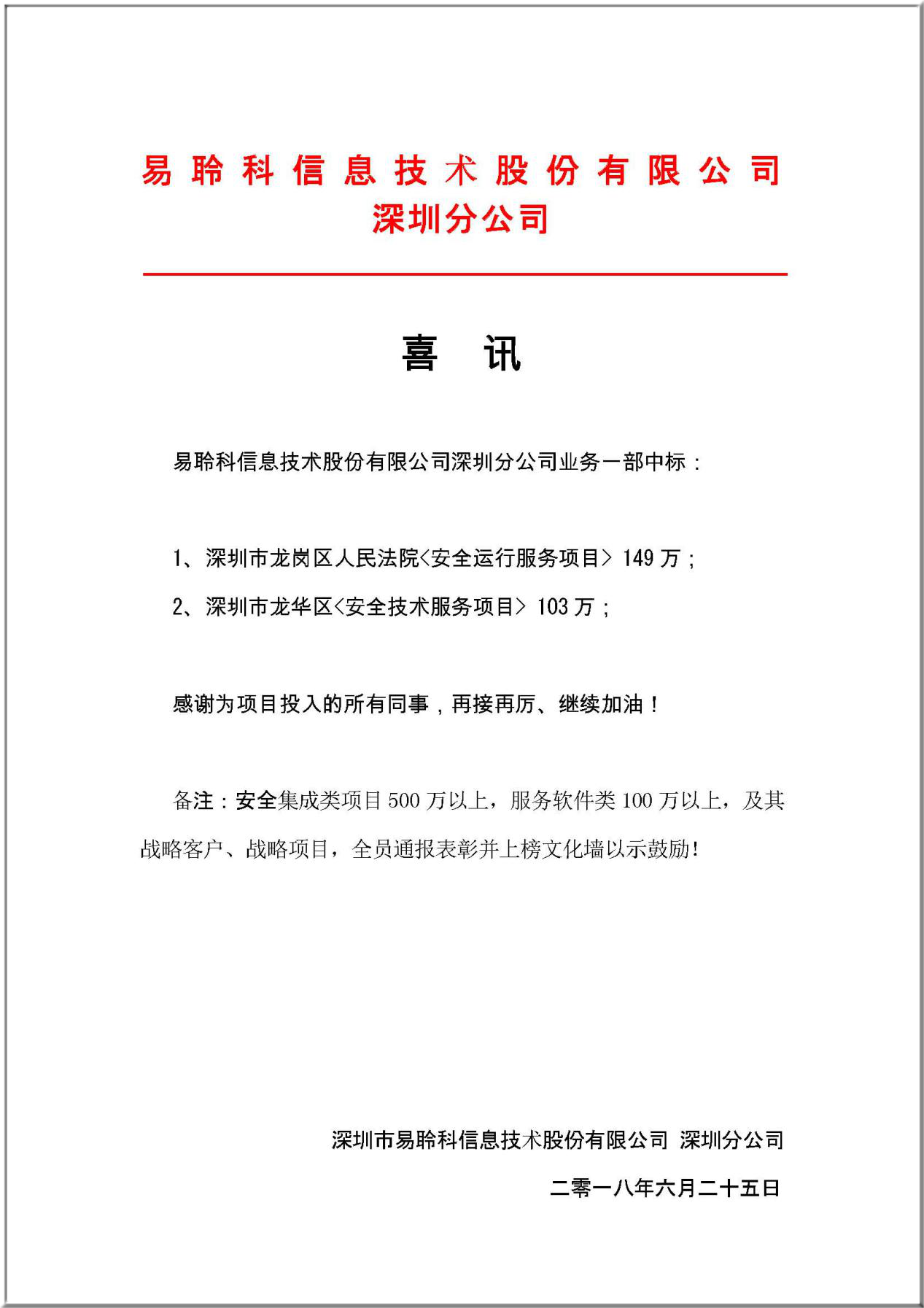 首先是深圳分公司的业务一部的小伙伴“深圳市龙岗区人民法院安全运行服务149万”