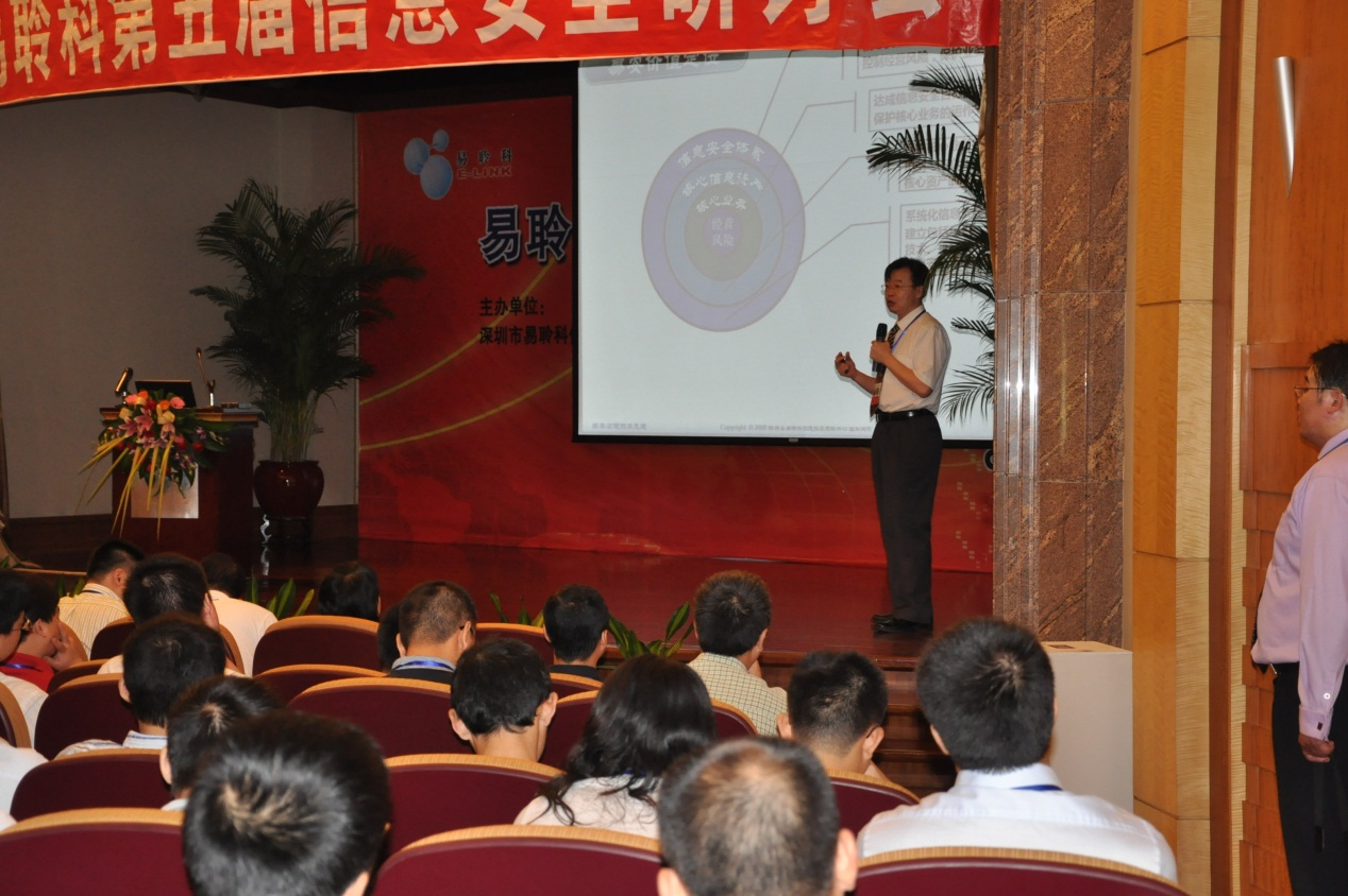 届时我们邀请到深圳市科工贸信委信息化推进处黄爱萍处长、信息安全处邓中副处长、副调研员陈跃曾、市委保密委员会办公室赵力处长、市建设局勘察设计与科技处张雁处长、南山区科技局副调研员刘石明、罗湖科技局副局长吴向民,以及国土规划局、信息网络中心、市国税局、市地税局等领导,万科集团、中集集团、比亚迪股份有限公司、招商局集团、英大证券、中信银行等诸多中大型企业和众多信息安全厂商出席了本次盛会。正因为得到了大家的鼎力支持,本次研讨会规模超过了往年任何一届,达到200多人,会场专家云集,对于南山区中小企业来说,能成功举办此类重大活动可谓是相当不容易的事。