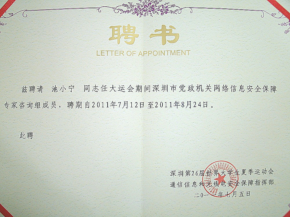热烈祝贺易聆科副总裁池小宁同志被聘任大运会期间深圳市党政机关网络信息安全保障专家咨询组成员。