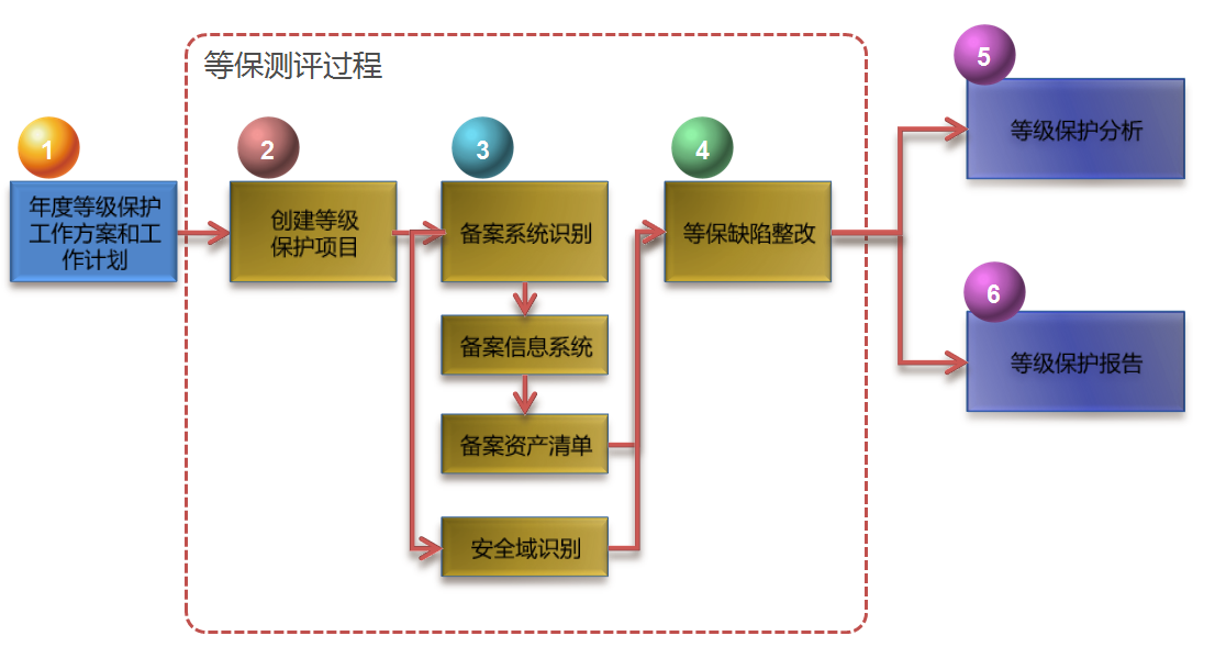 从信息系统定级备案、制定等级保护工作计划、量化指标评估、缺陷跟踪整改到等级保护报告的等级保护工作全流程管理。基本流程如下: