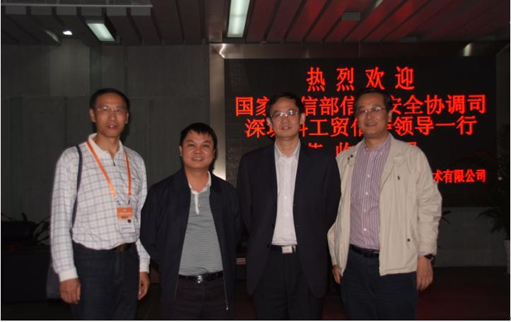 于2011年11月18日国家工信部信息安全协调司领导、深圳市科工贸信委领导莅临易聆科公司指导工作,易聆科总裁彭建中先生,副总裁池小宁先生、司亚骞先生等公司高层接待了各位领导一行。