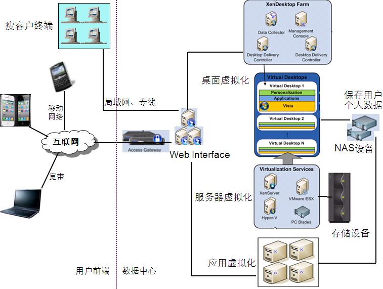 虚拟化IT将企业信息化变成两部分,即数据中心和用户前端: