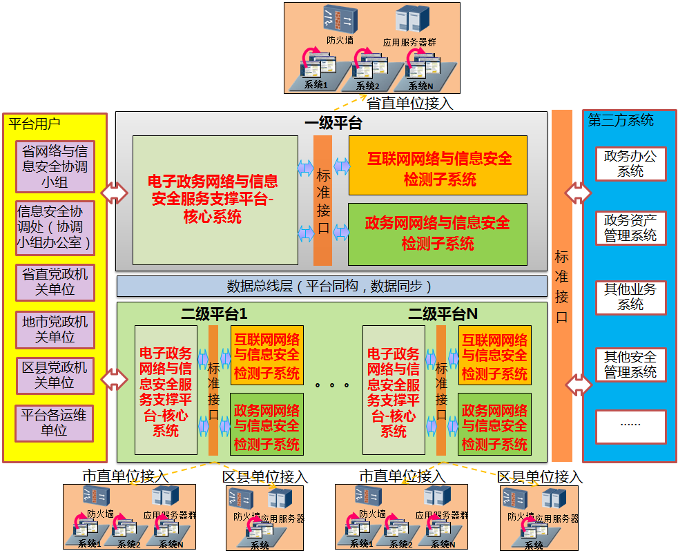 平台包括电子政务网络与信息安全服务支撑平台-核心系统、互联网网络与信息安全检测子系统、政务网网络与信息安全检测子系统,各子系统之间通过标准接口紧密互通。