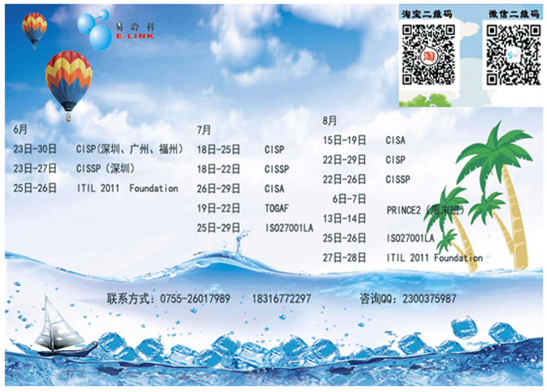 网络空间安全的威胁与日俱增,极大的推动了信息安全领域的蓬勃发展,为贯彻《国务院关于大力推进信息化发展和切实保障信息安全的若干意见》进一步培养各行业、各单位信息安全规划、建设、运维、管理人才,逐步开展从业人员资质认定工作,构建一支国家认可的行业信息安全专业人才队伍,我学院拟定于2016年8月长期举办CISP国家注册信息安全专业人员培训,现将有关事项通知如下: